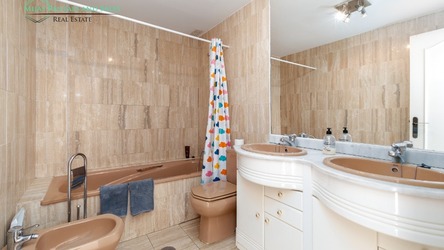 The apartment features two comfortable bedrooms and two bathrooms, including a master bedroom with en-suite bathroom. Both the living room and main bedroom are equipped with air-conditioning, ensuring comfort throughout the year. The bright living room opens directly onto the terrace, creating a light-filled and comfortable space ideal for relaxing after a day at the beach.