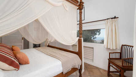 Bungalow 3 The third bungalow has a bath with shower over and heated towel rail. It has a sitting room which leads through to the bedroom with its 4 Poster Bed. There is a fridge and coffee machine.